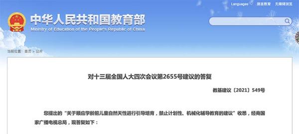 日前,教育部對(duì)“關(guān)于順應(yīng)學(xué)齡前兒童自然天性進(jìn)行引導(dǎo)培育,禁止計(jì)劃性、機(jī)械化輔導(dǎo)教育的建議”答復(fù)中指出,3-6歲是兒童認(rèn)知、語言、社會(huì)性發(fā)展的關(guān)鍵階段,尊重幼兒的身心發(fā)展規(guī)律,實(shí)施科學(xué)的保育與教育,對(duì)幼兒健康成長(zhǎng)具有重要意義。教育部高度重視幼兒園保育教育工作,采取多種措施提高幼兒園保教質(zhì)量。印發(fā)《幼兒園教育指導(dǎo)綱要》(以下簡(jiǎn)稱《綱要》)和《3-6歲兒童學(xué)習(xí)與發(fā)展指南》(以下簡(jiǎn)稱《指南》),提出應(yīng)尊重幼兒身心發(fā)展的規(guī)律和學(xué)習(xí)特點(diǎn),以游戲?yàn)榛净顒?dòng),保教并重,促進(jìn)每個(gè)兒童富有個(gè)性的成長(zhǎng),嚴(yán)禁“拔苗助長(zhǎng)”式的超前教育和強(qiáng)化訓(xùn)練。